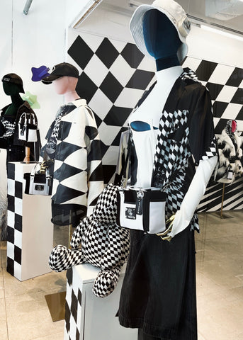 PRIVATE POLICY designed a Summer Mini Cooler Tote Bag and Checker Printed Silky Camp Shirt, inspired by the iconic White Claw black and white color combo and the wave logo.