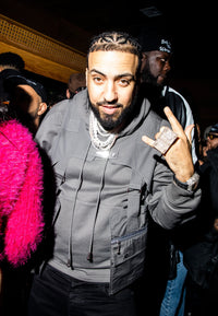 French Montana for GQ event in PRIAVTE POLICY Harness Hoodie